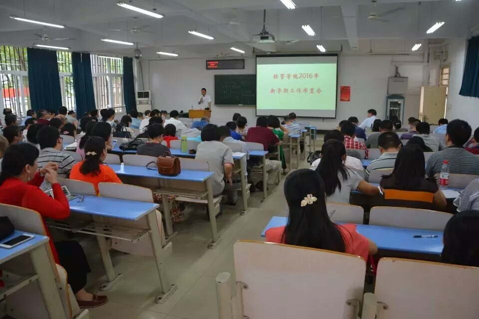 2016年9月8号下午2:30,经管学院于北综202召开2016新学期工作布置会。这次会议由经管学院党委书记隋红书记主持,学院全体教职工参加。会议首先介绍了暑假期间到岗的院党委副书记沈波老师和今年新入职的教员。